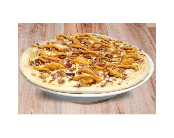 Ref.: CYBase crème, steak haché, merguez, TENDERS, oignons frits, mozzarella et sauce algérienne.